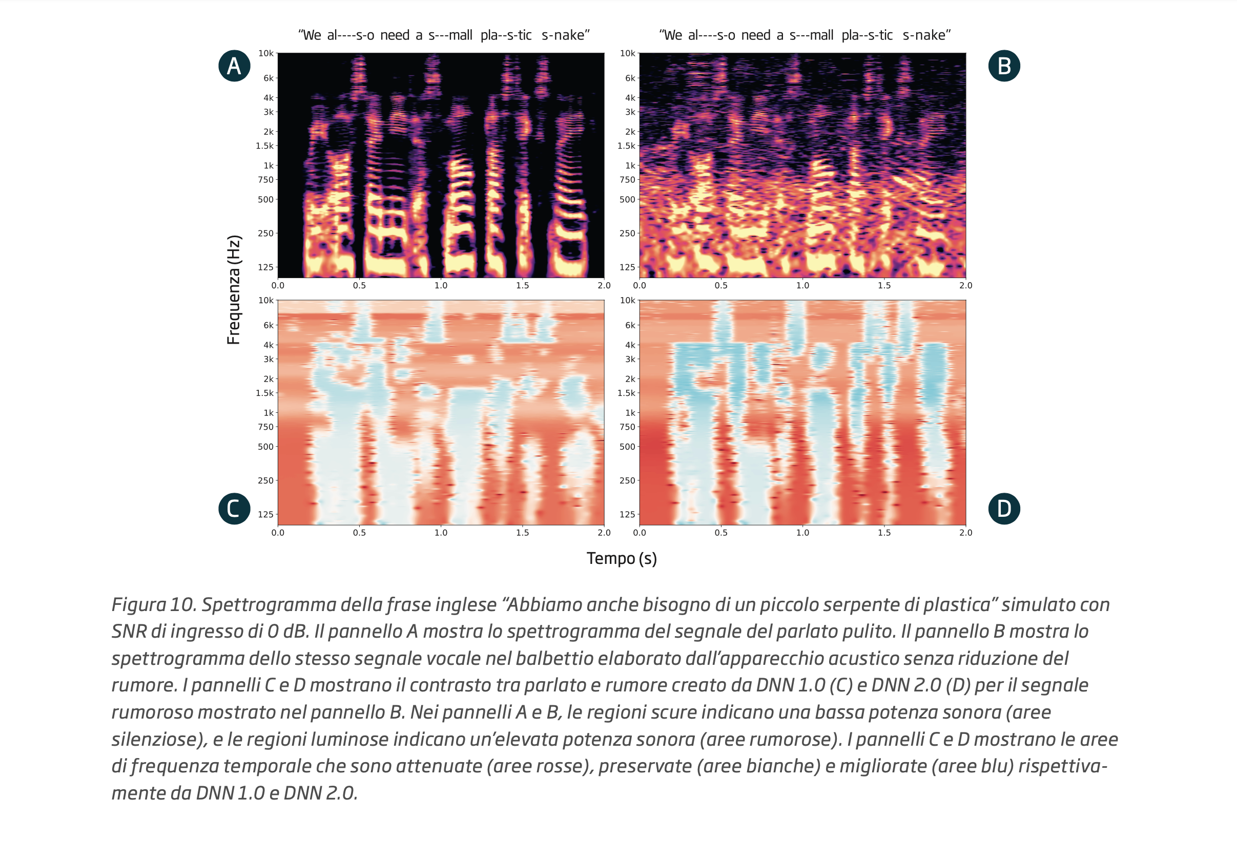 Accesso agli indizi vocali: abbiamo utilizzato un sistema metrico oggettivo di intelligibilità vocale per quantificare l’accesso agli indizi vocali e l’analisi dello spettrogramma per esaminare la capacità dell’apparecchio acustico di preservare i dettagli del parlato in presenza di rumore.