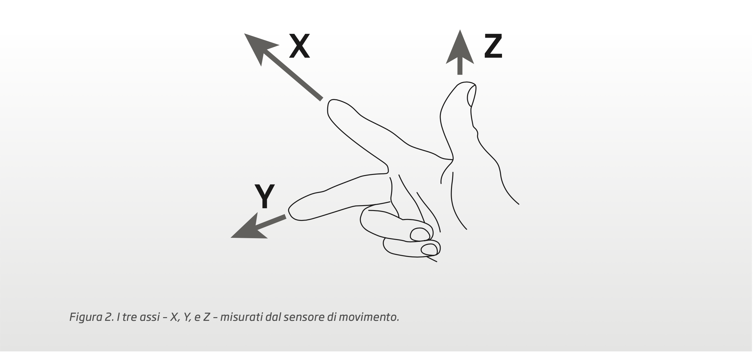 L’accelerometro misura l’accelerazione dei movimenti dell’utente. Più veloce e vigoroso è il movimento, maggiore è l’impatto sull’accelerometro. L’accelerometro misura il movimento lungo tre assi diversi: X, Y e Z (vedere Figura 2).