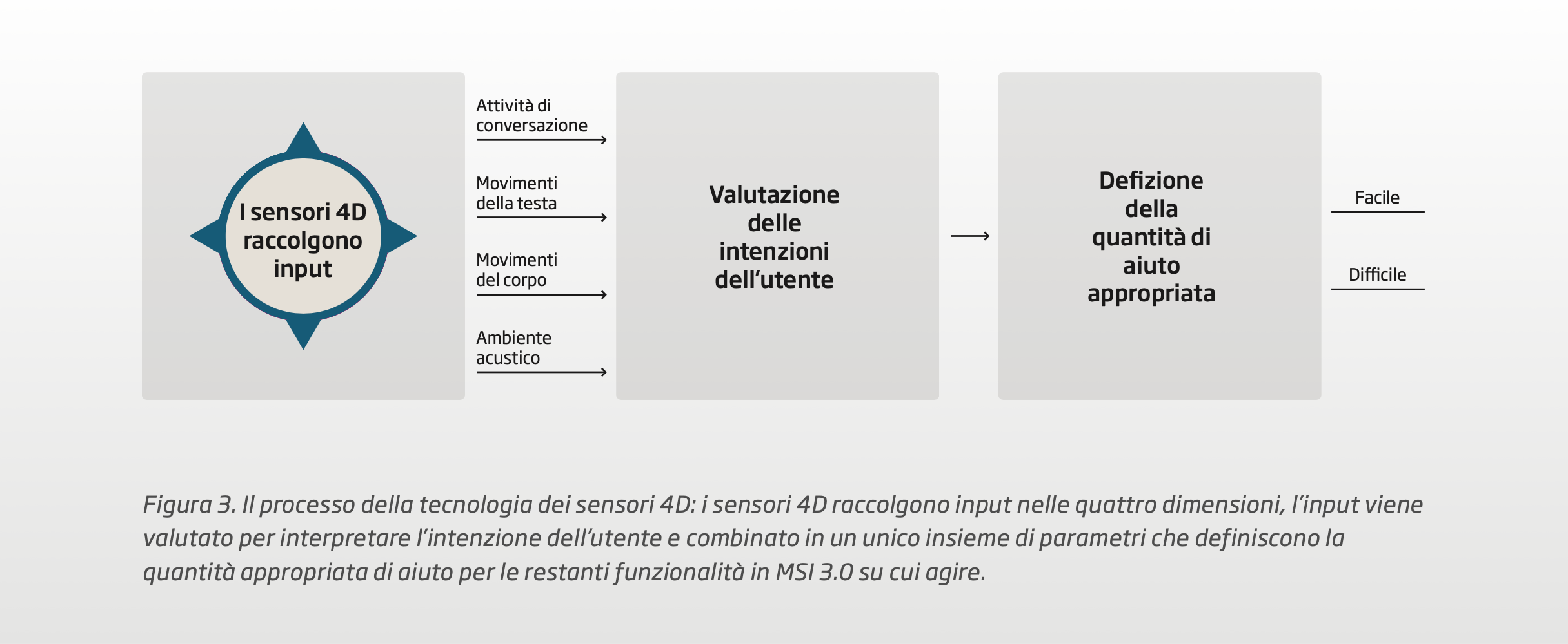 I sensori monitorano costantemente i movimenti, l’attività di conversazione e i suoni nell’ambiente per fornire l’input corretto al sistema. Ogni sensore porta il risultato della propria analisi. Questi vengono combinati per formare un unico insieme raffinato di parametri per le rimanenti funzionalità di MSI 3.0 (Bilanciamento Spaziale basato sull’intenzione e DNN 2.0) su cui agire. Imposta il livello di supporto richiesto dall’intento dell’utente e dall’ambiente sonoro (vedere Figura 3).