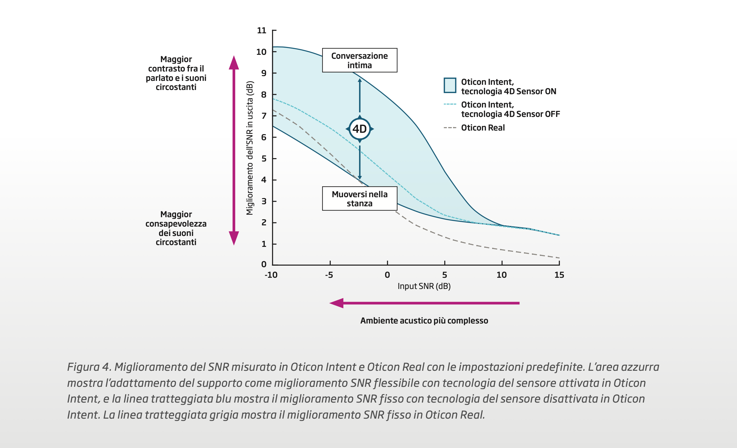 L’SNR in uscita è stato misurato per Oticon Intent con tecnologia 4D Sensor sia attivata che disattivata, così come per il dispositivo premium della generazione precedente, Oticon Real. La Figura 4 illustra il miglioramento dell’SNR in uscita per vari livelli SNR in ingresso, che rappresentano diverse complessità nell’ambiente di ascolto. I risultati dimostrano che Oticon Intent fornisce un supporto superiore agli utenti, con un miglioramento fino a 5 dB rispetto a Oticon Real durante una conversazione intima in un ambiente di ascolto rumoroso. Quando la tecnologia 4D Sensor è disattivata, un miglioramento fino a 1,5 dB (confrontando la curva blu tratteggiata e la curva grigia tratteggiata nella Figura 4) è principalmente attribuito a DNN 2.0 aggiornata sulla nuova piattaforma Sirius. I risultati presentati nella Figura 4 evidenziano inoltre che Oticon Intent con la tecnologia 4D Sensor attivata fornisce un range di adattamento più ampio fino a 5 dB in base all’intento di ascolto dell’utente. Un SNR di uscita più elevato indica un miglioramento della chiarezza nel parlato, mentre un SNR di uscita inferiore consente un maggiore accesso ai suoni circostanti. Pertanto, Oticon Intent può fornire costantemente agli utenti il livello appropriato di supporto e accesso ai suoni circostanti all’interno dello stesso ambiente di ascolto, sia che siano impegnati in una conversazione intima o che si stiano muovendo nella stanza.