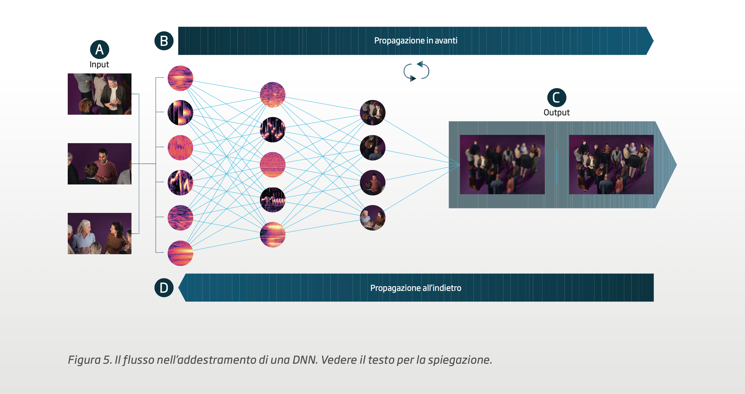 DNN 2.0 è la rete neurale profonda di nuova generazione sviluppata con cicli di addestramento completamente nuovi. Per fornire informazioni su come è stato eseguito il nuovo addestramento, questa sezione esaminerà le quattro fasi del processo di addestramento. I passaggi sono quelli mostrati nella Figura 5: Ingresso (A) – la DNN riceve l’input sulla scena sonora, Propagazione in avanti (B) – la DNN elabora la scena sonora, Uscita (C) – la DNN produce l’uscita udibile e Propagazione all’indietro (D) – viene fornito feedback per un ulteriore miglioramento dell’elaborazione nella DNN.