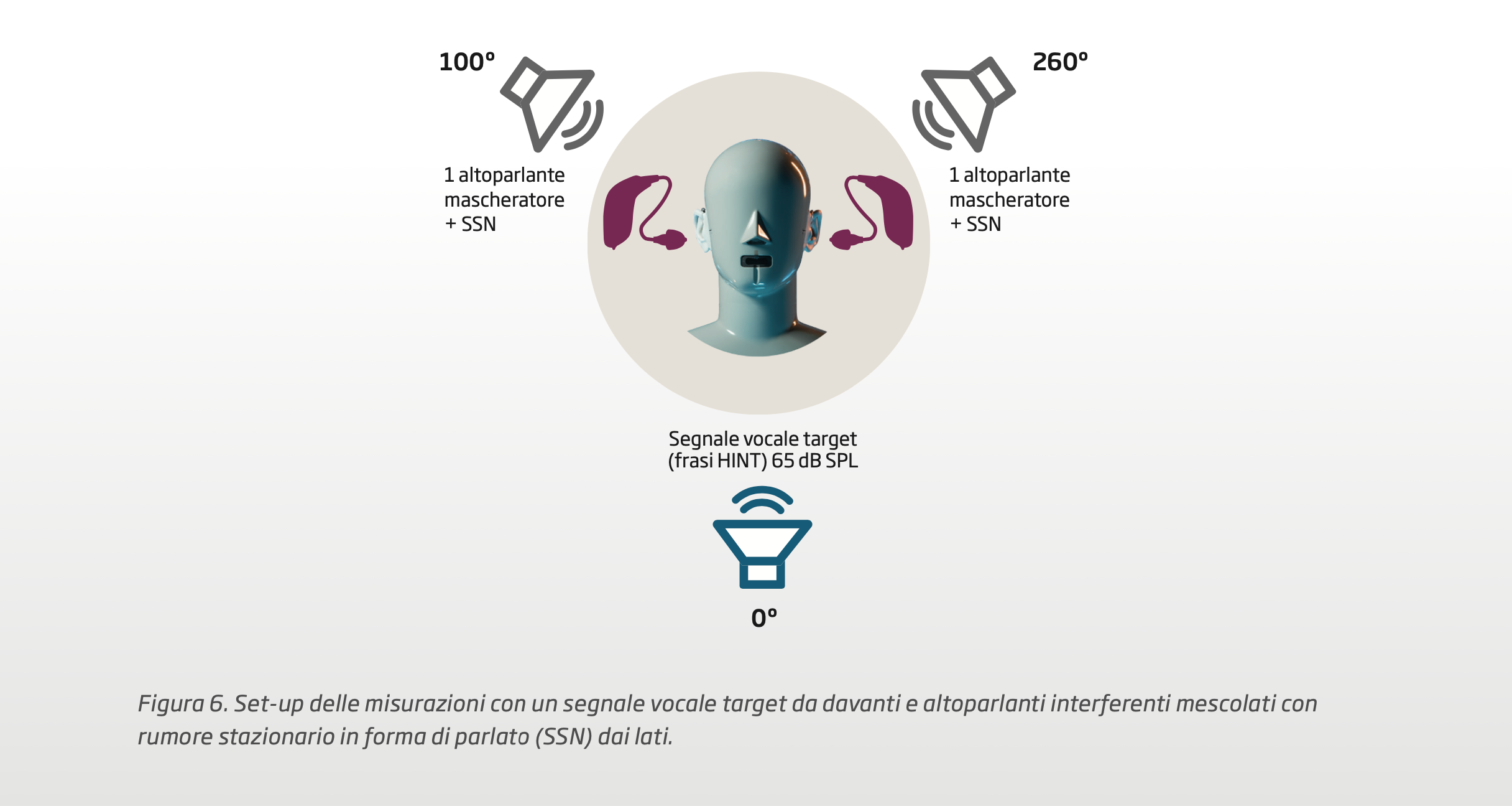 Per valutare le prestazioni di Oticon Intent, abbiamo condotto una valutazione tecnica sistematica e lo abbiamo confrontato con il nostro dispositivo premium precedente, Oticon Real. L’obiettivo principale era valutare la capacità dell’apparecchio acustico di fornire supporto uditivo per il parlato in situazioni di ascolto complesse. A questo scopo abbiamo allestito una procedura di test controllata in uno studio sonoro trattato acusticamente in cui abbiamo simulato una conversazione intima. Ciò ha comportato il posizionamento di un simulatore di testa e busto (HATS) al centro della stanza, a 1,6 metri di distanza da un altoparlante (0°) che riproduceva un segnale vocale target. Inoltre, due altoparlanti sono stati posizionati a 100° e 260°, come illustrato nella Figura 6, e fungevano da mascheratori. Gli altoparlanti mascheratori presentavano oratori interferenti mescolati con rumore stazionario in forma di parlato (SSN). Il target è stato costantemente riprodotto a 65 dB SPL, mentre il suono dei mascheratori variava da 50 a 75 dB SPL. Ciò ci ha permesso di esplorare una serie di scenari di ascolto da molto semplici a molto complessi.