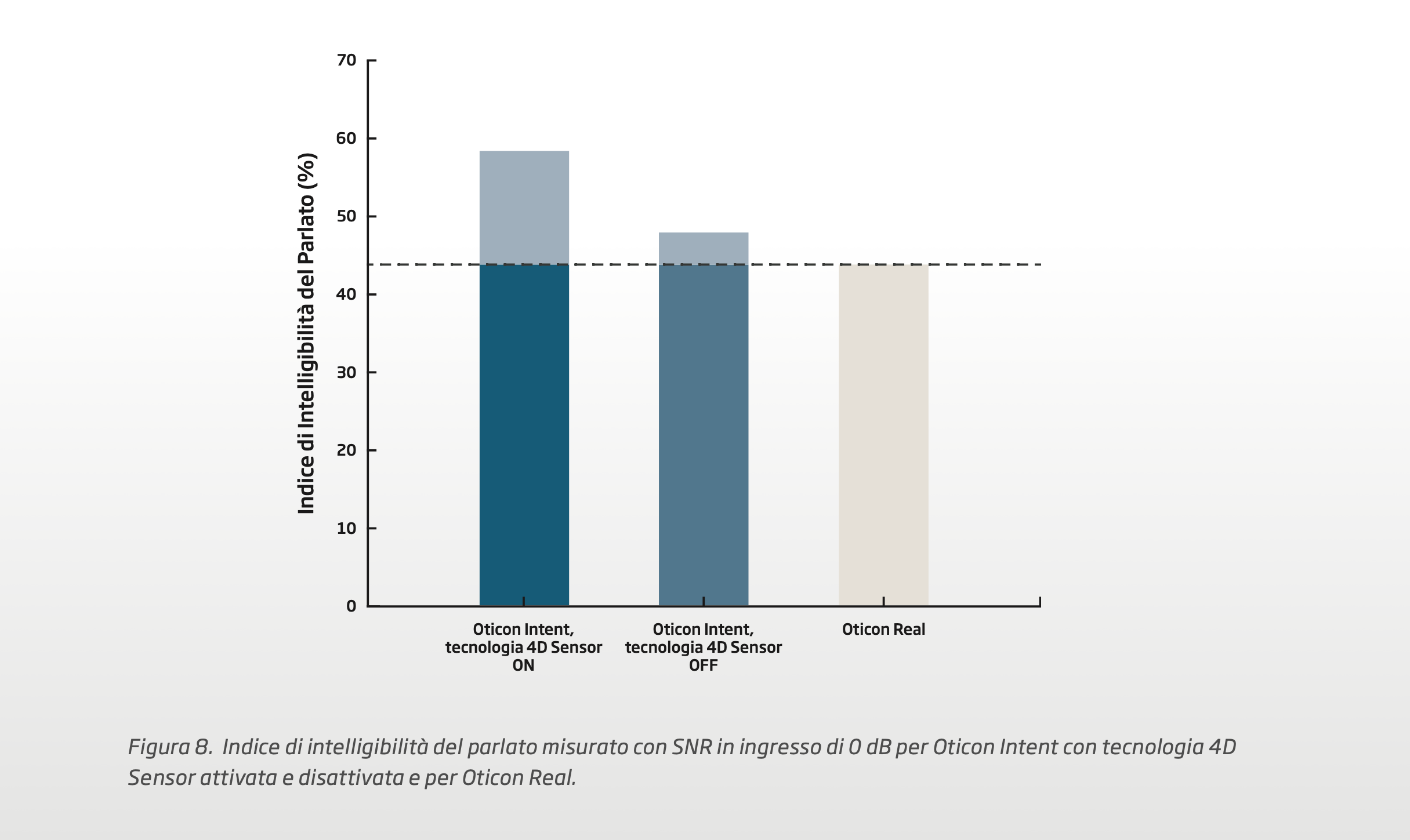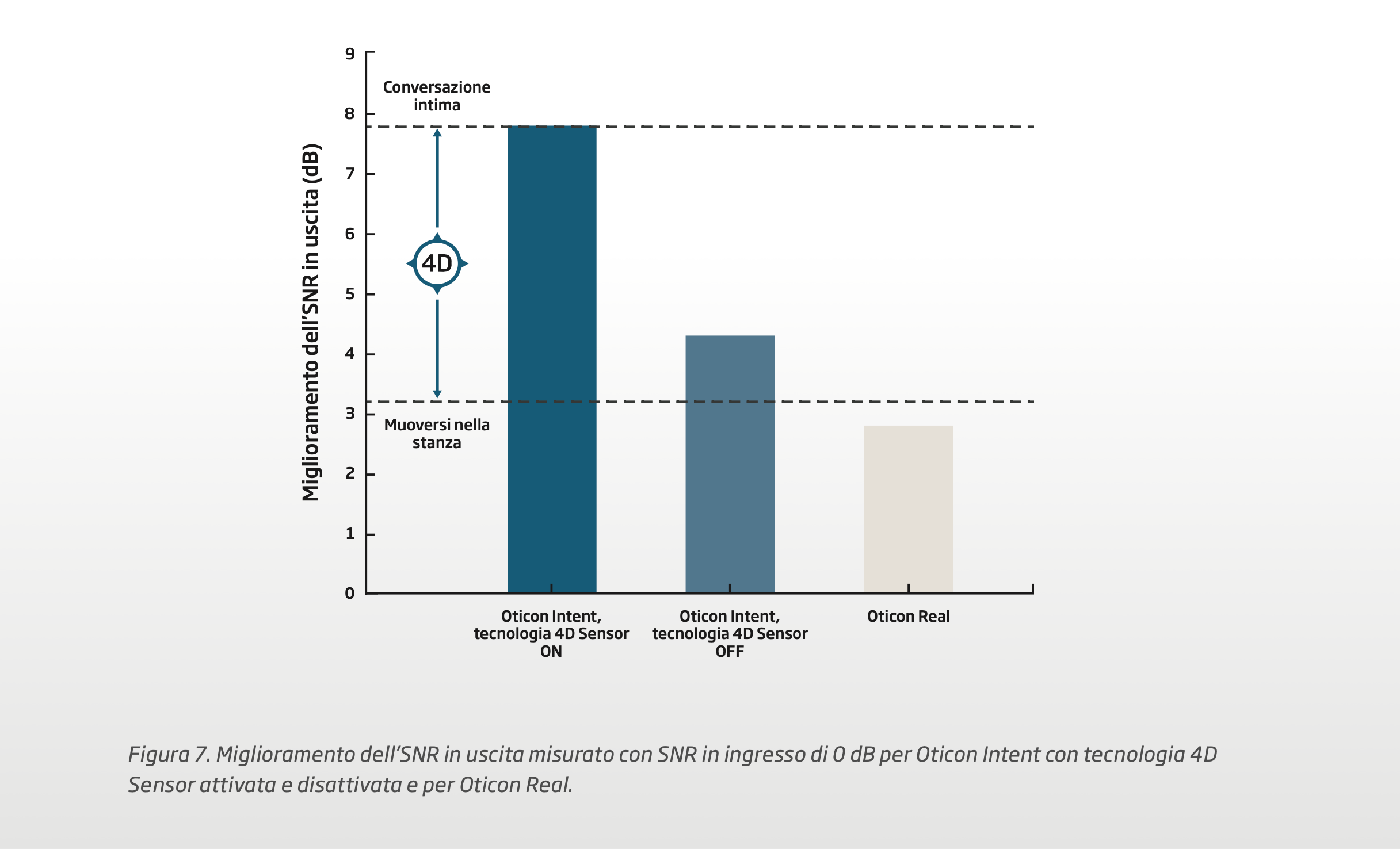 Ciò è illustrato nella Figura 7, dove viene mostrato che l’SNR di uscita per Oticon Intent è maggiore di 5 dB quando la tecnologia 4D Sensor è attiva e di 1,5 dB quando è disattivata, rispetto a Oticon Real. Questi risultati evidenziano che Oticon Intent eccelle nel far risaltare il segnale target dal rumore di fondo, rappresentando un miglioramento nella chiarezza del parlato che è stato riscontrato migliorare significativamente la capacità dell’utente di comprendere il parlato (Bianchi/ Eskelund et al., 2024).