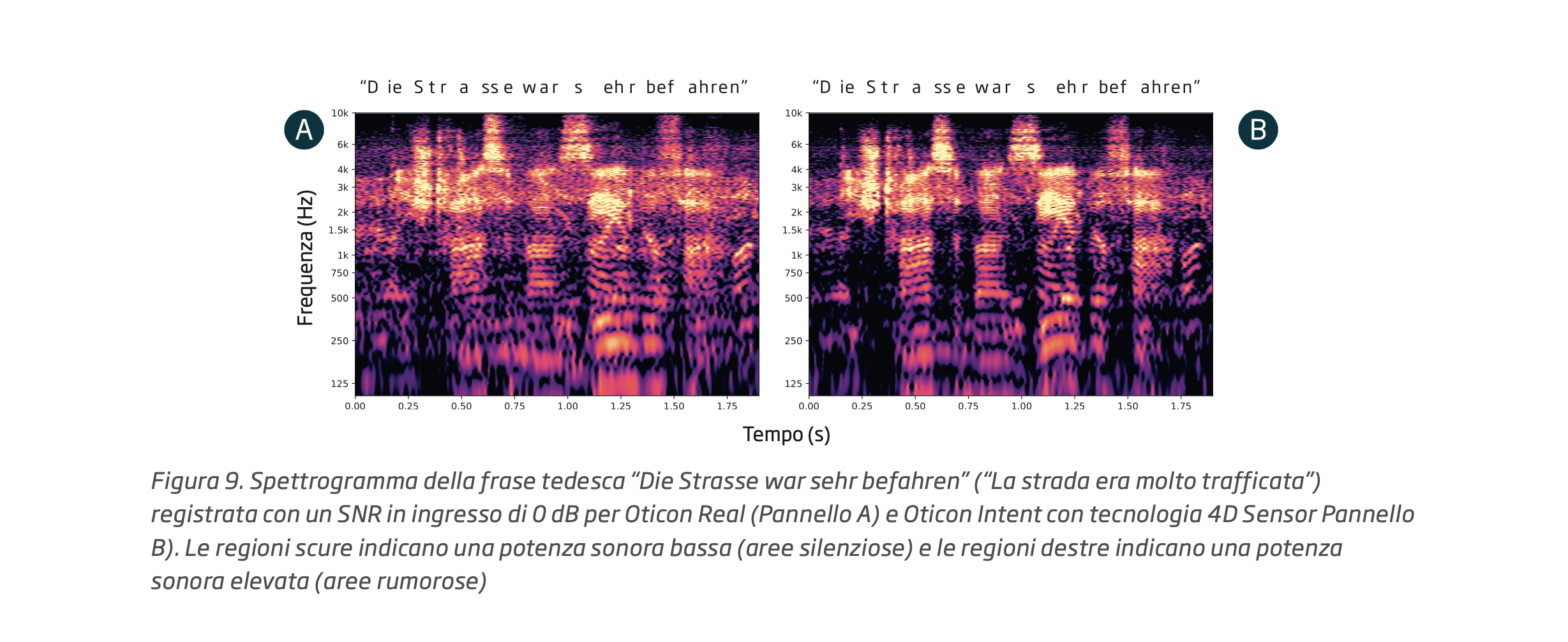 Inoltre, il segnale vocale può essere identificato più chiaramente nello spettrogramma ottenuto per Oticon Intent. Si noti ad esempio la rappresentazione più fine e precisa delle armoniche della vocale “a” e una migliore conservazione del suo contenuto frequenziale per Intent nel pannello B. Quindi, Oticon Intent preserva meglio i dettagli del parlato riducendo al contempo più rumore di fondo rispetto a Oticon Real, fornendo così agli utenti una migliore chiarezza del parlato.